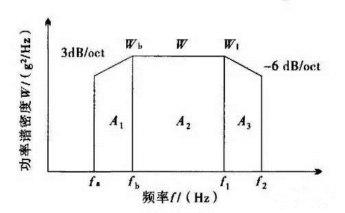 隨機振動試驗需要顧及的有:隨機振動推力和隨機振動最大位移,隨機振動一般給出功率譜密度與頻率之間的關系曲線,如圖所示,根據該曲線及相關計算公式既可計算出加速度均方根值。