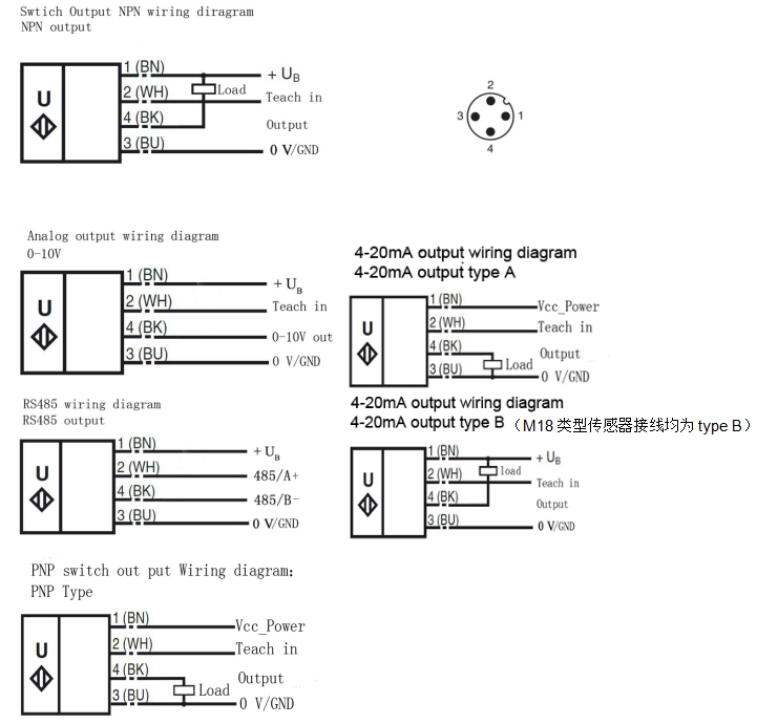 注意:M18產品和M30產品在4-20mA模擬量輸出時,電表接法和550,600產品有差異,由于M18和M30產品output端由VDD供電,如圖1所示,所以要將電表接到供電端口和output端之間,接法指示圖如圖2所示: