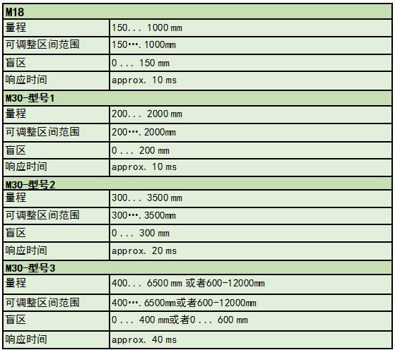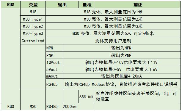子系列包括KUS3000 M18、KUS3000 M30-Type1、KUS3000 M30-Type2、KUS3000 M30-Type3,M18 超聲波傳感器采用緊湊而堅固的設計,在極端條件下表現良好。該超聲波傳感器由 PBT 塑料或不銹鋼外殼材料制成,具有漫反射、回射和組合操作模式,并為苛刻的操作條件提供功能和精度。