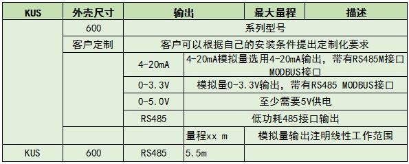 KUS600系列超聲波液位計(jì),5米量程,3.3~24V供電,休眠功耗低于0.2mA,PG7防水連接,串口喚醒,TTL,RS485,4-20mA,開(kāi)關(guān)量,電壓輸出,220kHZ頻率,添加串口透?jìng)髂K可實(shí)現(xiàn)遠(yuǎn)程液位物位測(cè)量,精度和耐溫程度同KUS550,可應(yīng)用于污水,清水,罐體,顆粒料,酸堿液,反應(yīng)釜,河道水庫(kù),腐蝕環(huán)境,谷倉(cāng)料倉(cāng)。