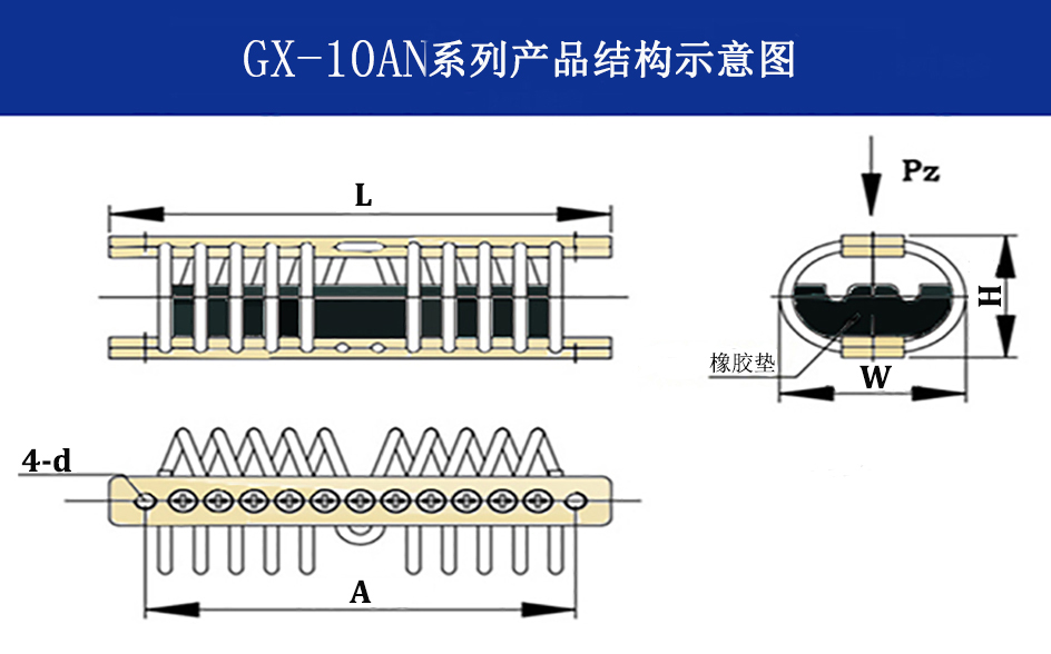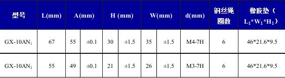 GX-10AN系列鋼絲繩隔振器Pz向公稱載荷為10N(1.02kg),根據(jù)其尺寸不同分為GX-10AN?型和GX-10AN2型兩種,GX-10AN系列鋼絲繩隔振器是對GX型鋼絲繩隔振器的進(jìn)一步改進(jìn),將長方體的橡膠墊改為與鋼絲繩緊密相貼的拱形橡膠墊,不僅對Pz方向進(jìn)行隔振緩沖,而且也保證了其它方向的隔振緩沖效果,可滿足高達(dá)100G以上的抗沖擊要求,適用于裝甲車輛、自行火炮、機載、車載、艦載等電子、機械設(shè)備、計算機與儀器儀表在高低溫、化學(xué)污染等惡劣環(huán)境下的隔振緩沖,導(dǎo)彈衛(wèi)星的運載、導(dǎo)航與發(fā)射系統(tǒng)的安全防護(hù)以及各類工業(yè)動力機械的工業(yè)降噪隔振等方面。